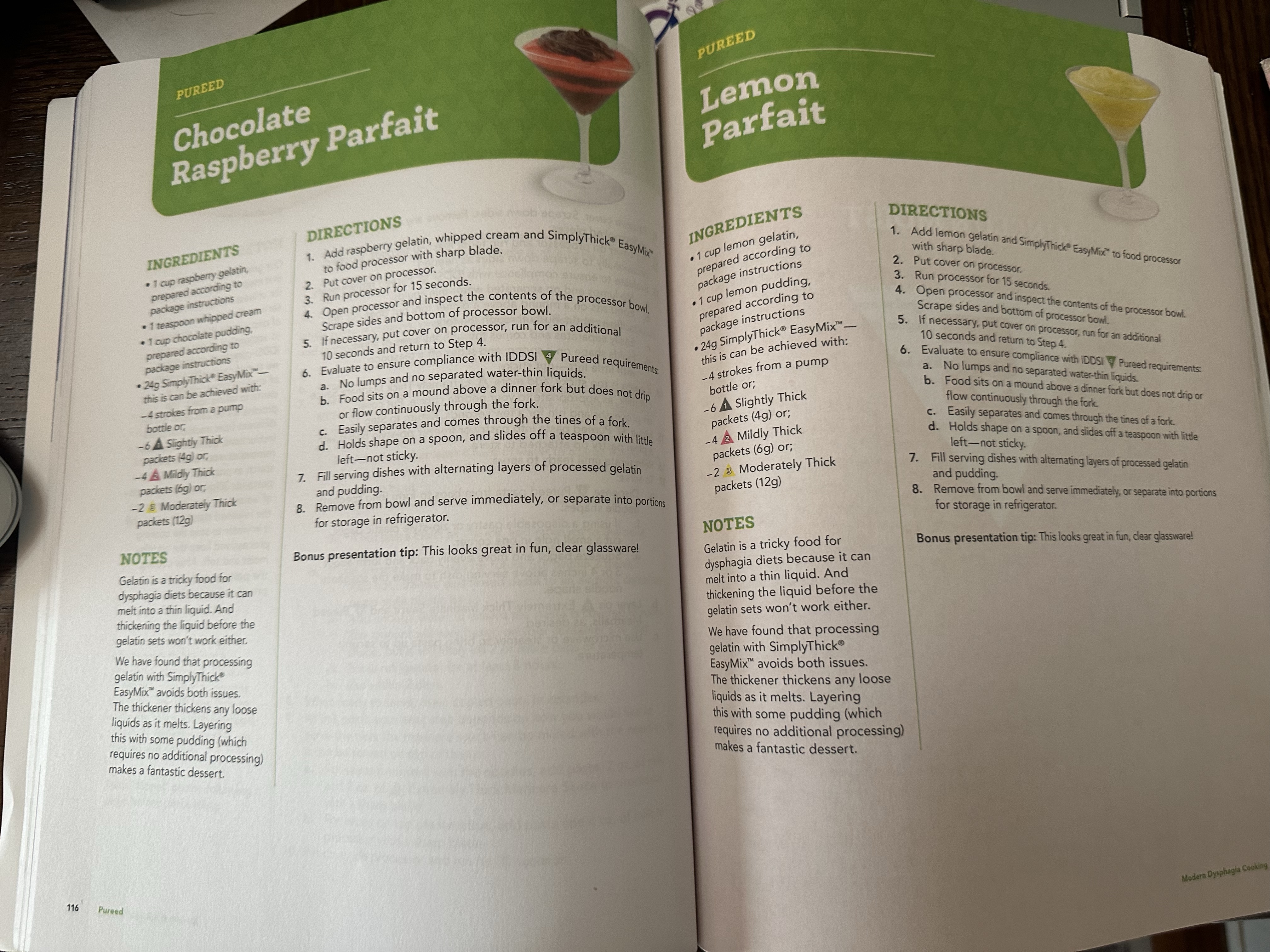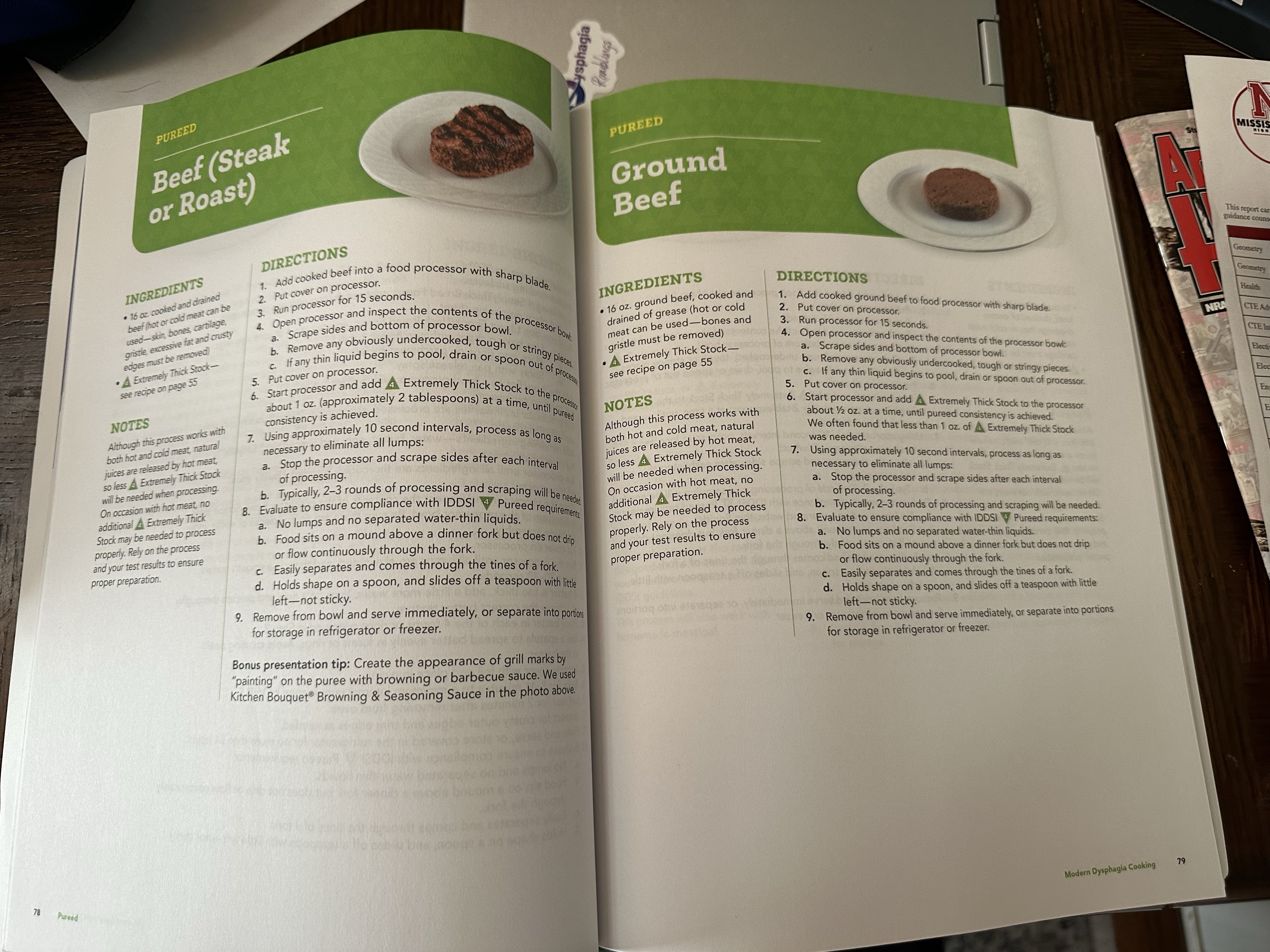 What I love the most about this cook book is that the recipes are simple. How to puree ham, chicken, hamburger, frozen pancakes, bread. The things that people want to eat but don’t know how to fix so that they are compliant with their diet levels.
